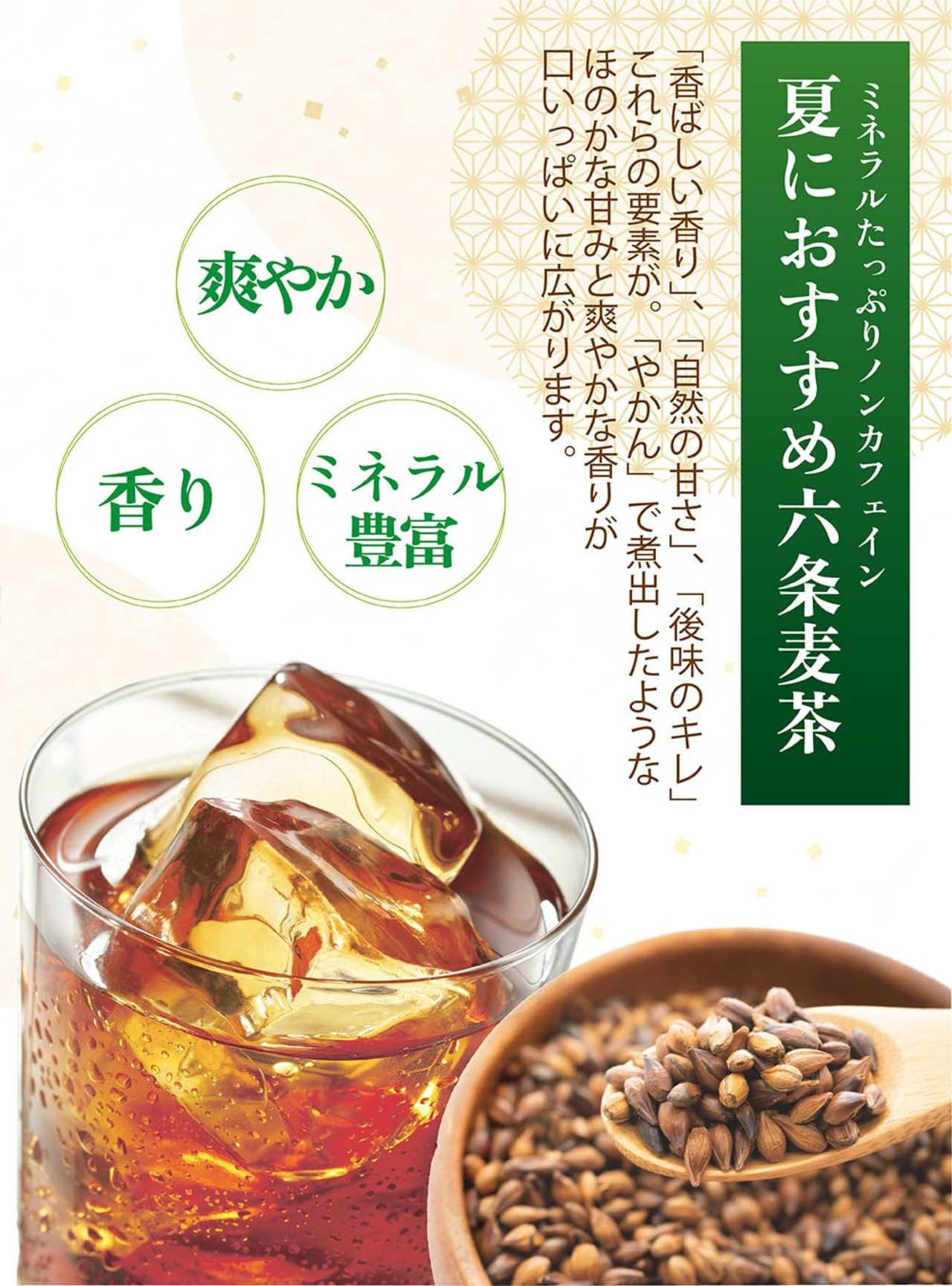 ・麦茶の大きな特徴は、ノンカフェイン・ノンカロリー世界中のお茶では珍しく、赤ちゃんでも飲む事ができる。そのほかにもミネラルが豊富で、胃にも優しく、味だけでなく多くの特徴があります。