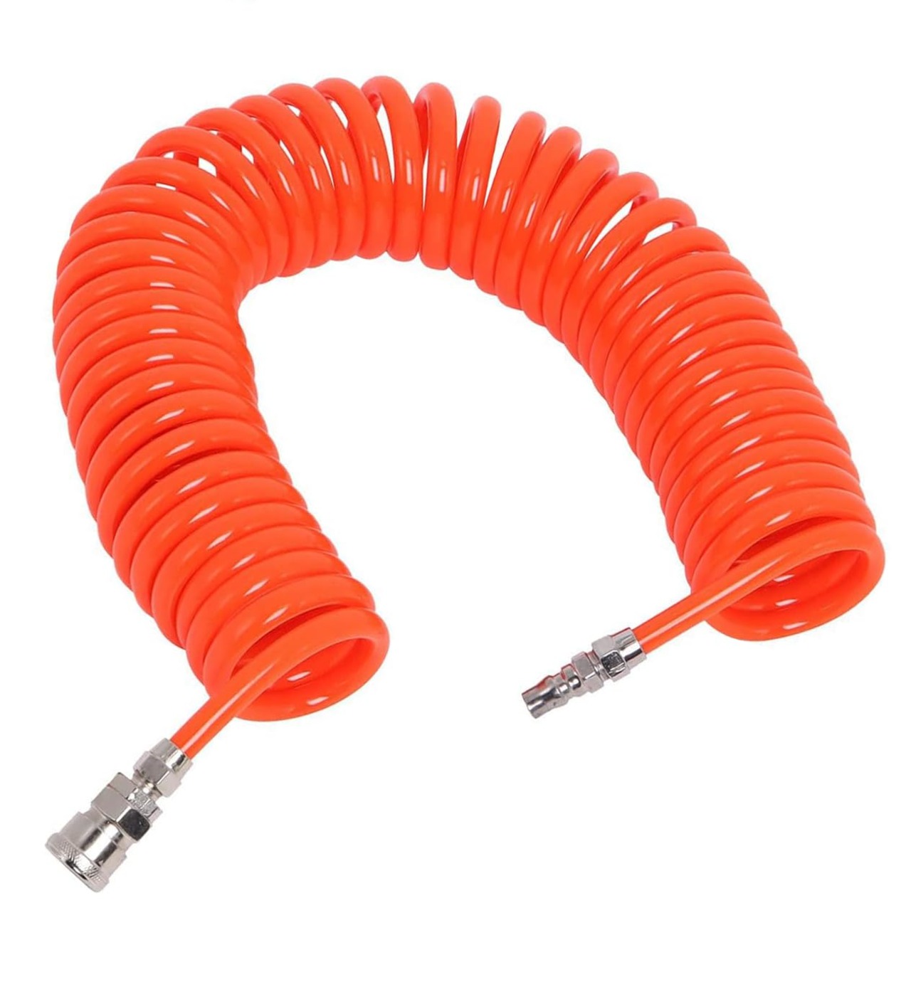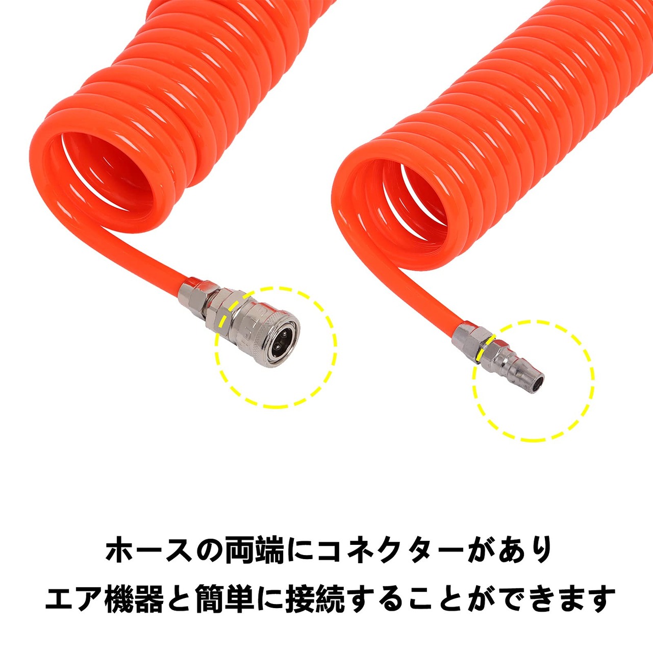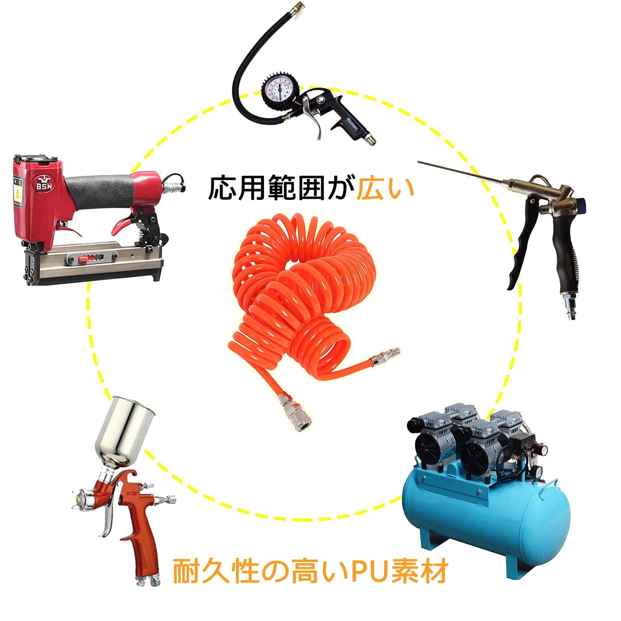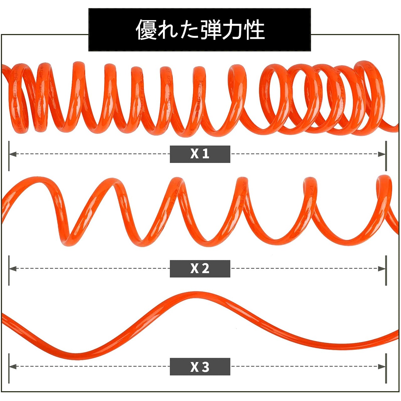 【高品質の材質】耐久性の高いPU素材の伸縮するバネ式エアーホースです。最長6メートルまで延長可能、ホースが折れにくく作業しやすいのが特徴です。空気圧ツール、パイプライン機器、機械潤滑剤、非腐食性の化学物質の輸送など様々な状況で使用できる万能ホースです。