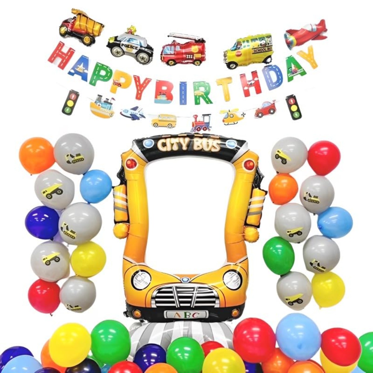 【セット内容】カラフルゴム風船 ×60個、乗り物バルーン 約 35cm × 各1個、大きなバスバルーン 約 90cm×130cm × 1個、プリントゴム風船 2種類 12inch × 各5個、バースデーガーランド × 1個、乗り物ガーランド × 1個