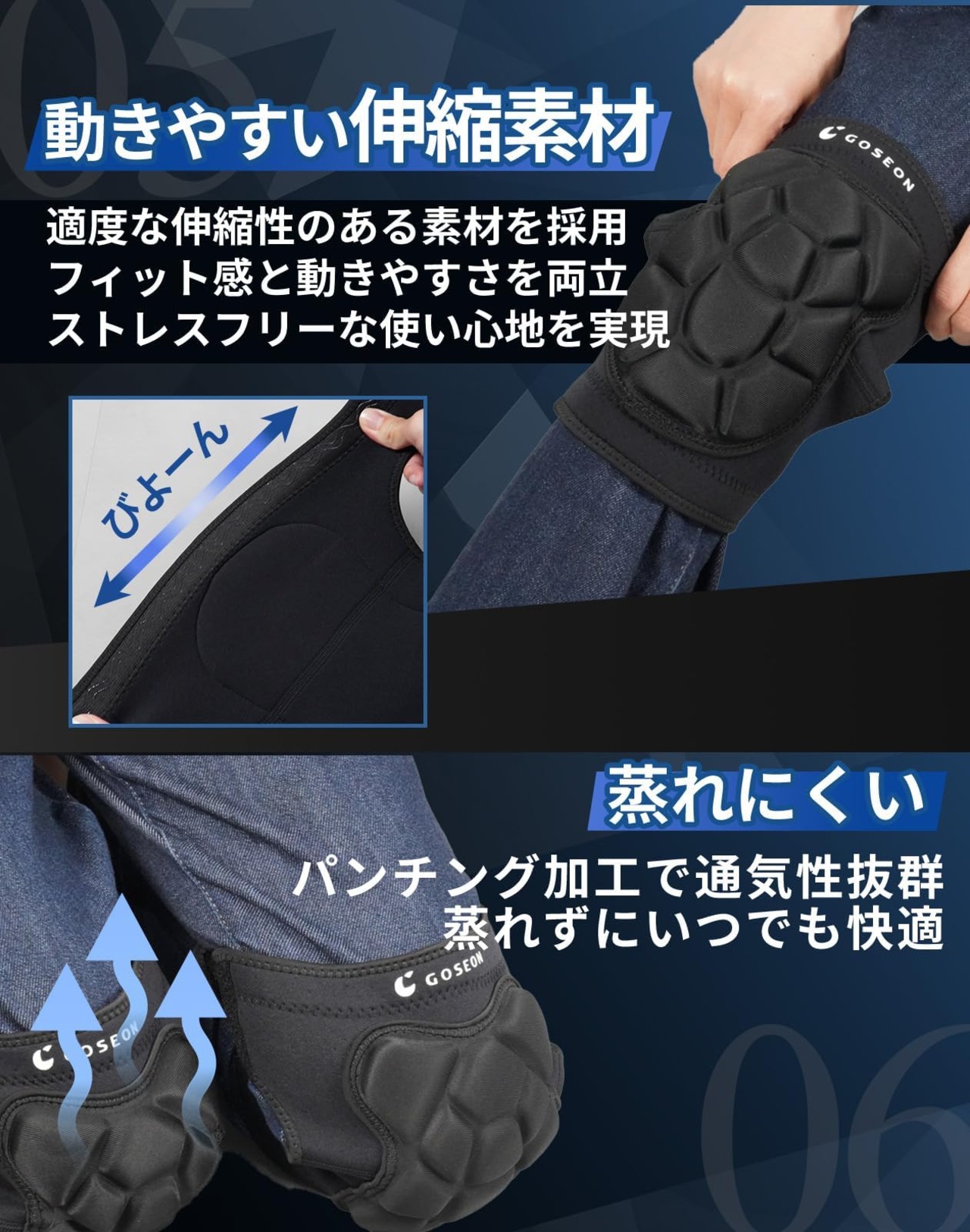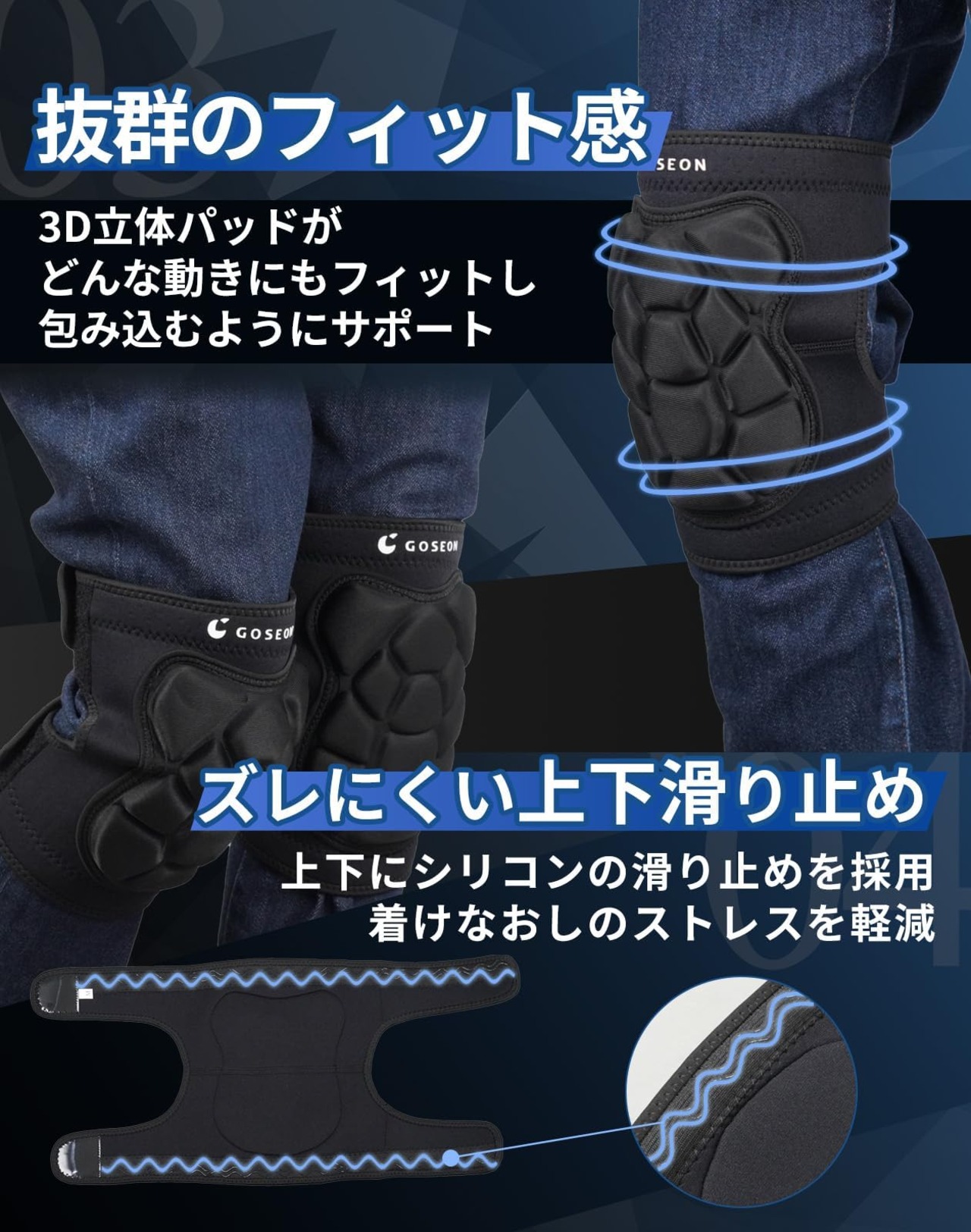 【強力面ファスナーで接着力をUP】従来のマジックテープから、より高密度繊維の面ファスナーを採用したことで、抜群の接着力を実現。マジックテープの耐久性が上がりこれまで以上に長期的にご使用いただけます。 【上下滑り止めでズレにくい】滑り止めがない場合や、片方にしか滑り止めがないことが一般的ですが、GOSEONの膝当てサポーターは上下に波状の滑り止めを採用。固定力を強化しズレずに作業ができきます。