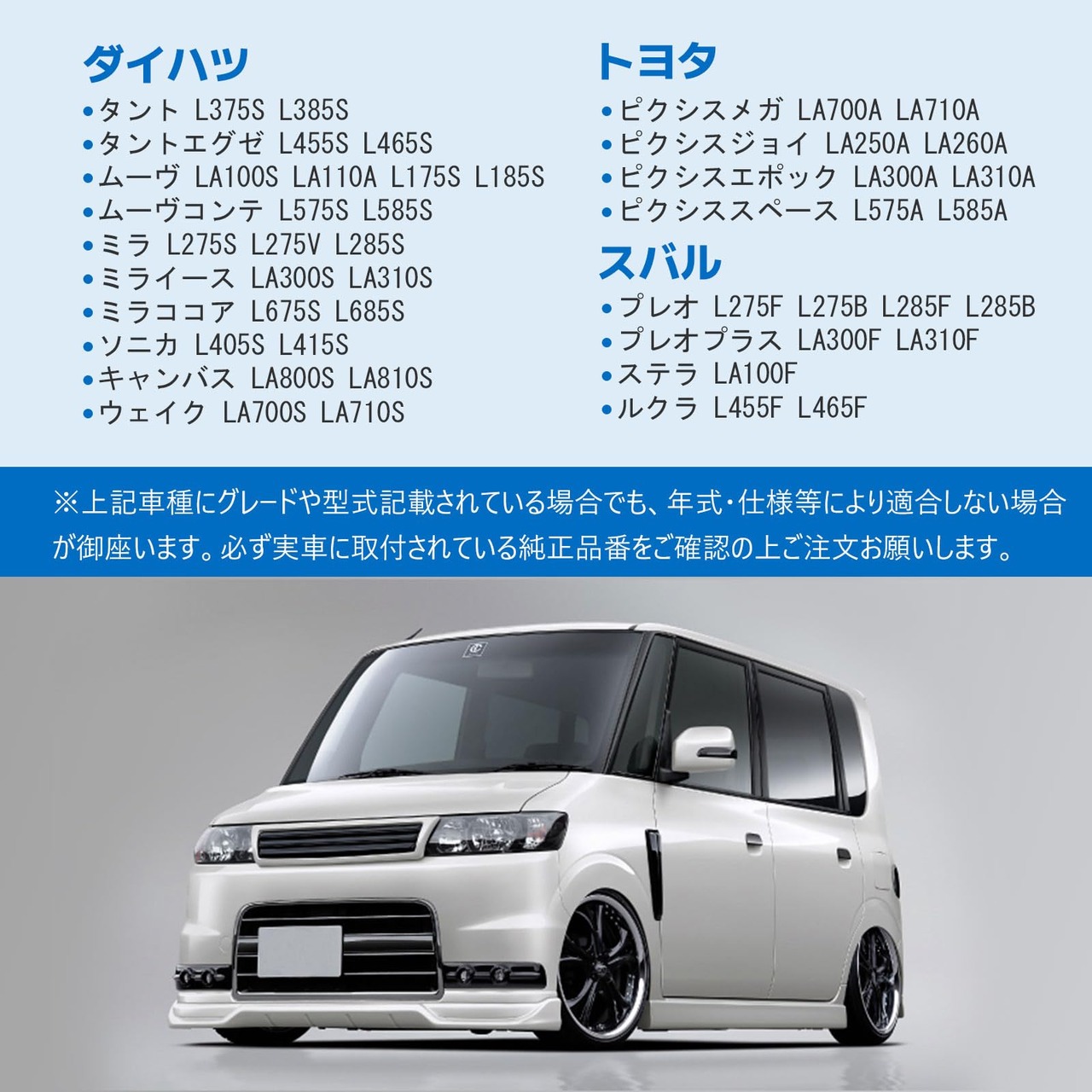 【主な適合車種】ダイハツ タント(L375S L385S)・ムーヴ(LA100S LA110A L175S L185S)・ウェイク(LA700S LA710S)。 トヨタ ピクシスメガ(LA700A LA710A・ピクシスジョイ(LA250A LA260A)。スバル プレオ(L275F L275B L285F L285B)・ステラ(LA100F)・ルクラ(L455F L465F)に適合します。詳しいのは商品詳細ページを参照してください。
