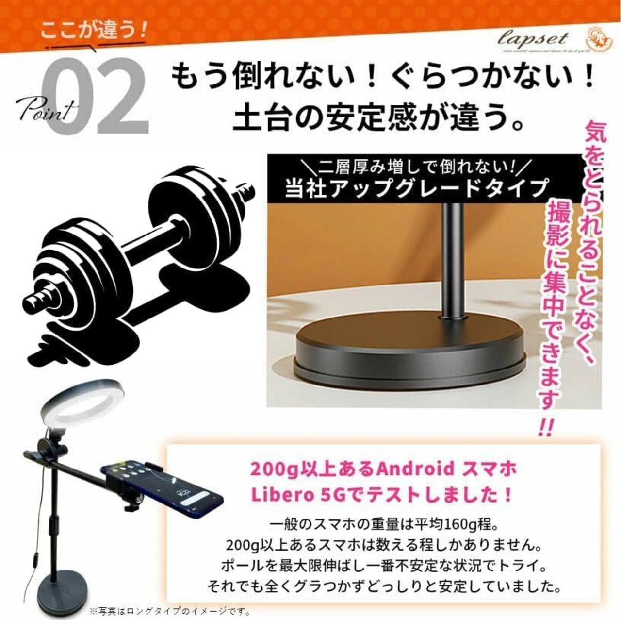 【床から約50㎝の高さから撮影できる】 全長57㎝、ライト直径16cm、 給電タイプ USB給電タイプ、ケーブル長さ 142㎝ 【土台が重いからこその安定感】台座部分が約1kg程の重さがあります。ずっしりとした安定感で、安心して撮影ができます。従来のスマホスタンドと比べ、その厚さは他のスマホスタンドに比べ約7倍。二層の厚みを持つ当社のアップグレードタイプの土台は200g以上あるスマホでも問題なく撮影できます。 【推奨USBコンセント】電圧(Voltage): 5V、電流(Current): 2.4A
