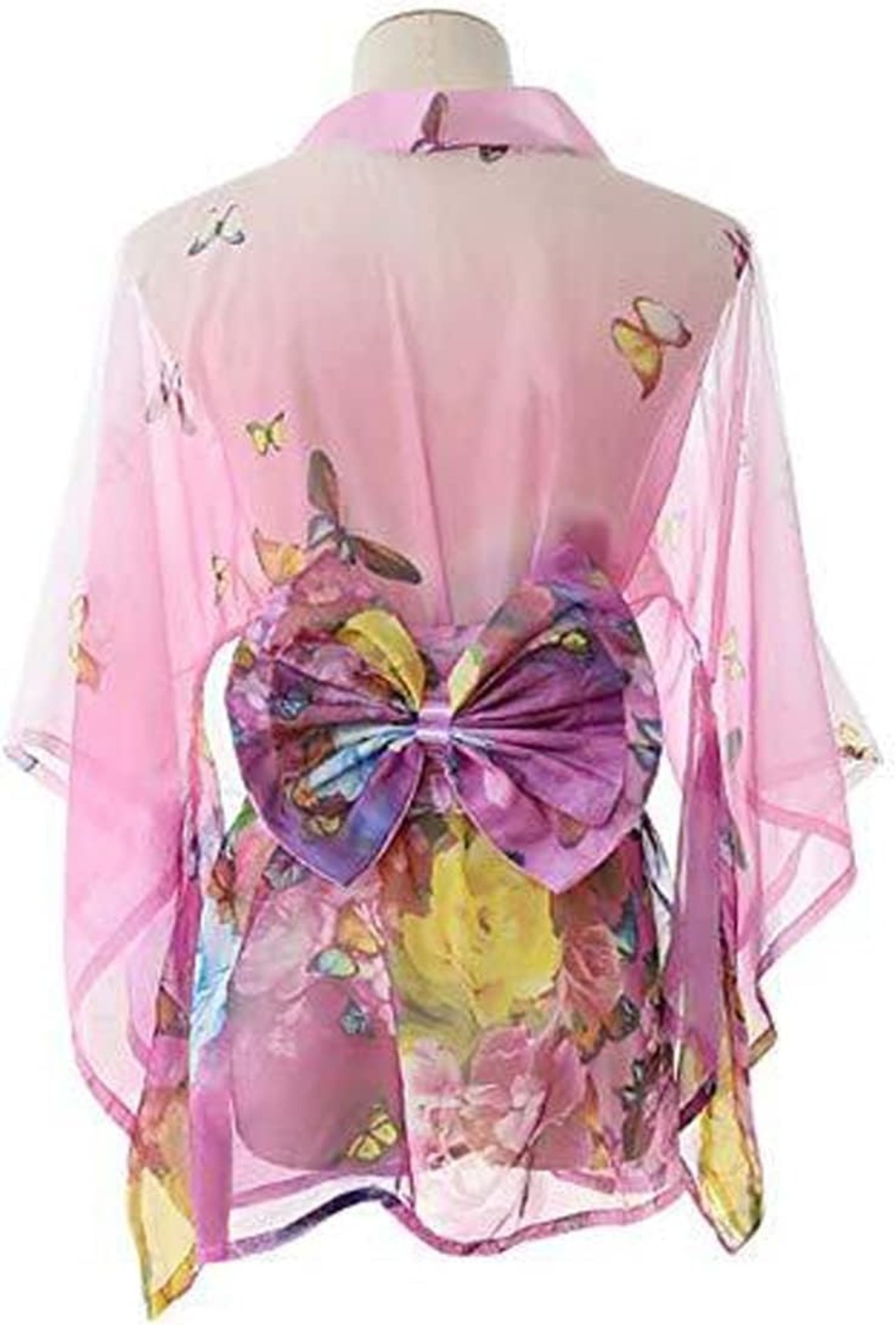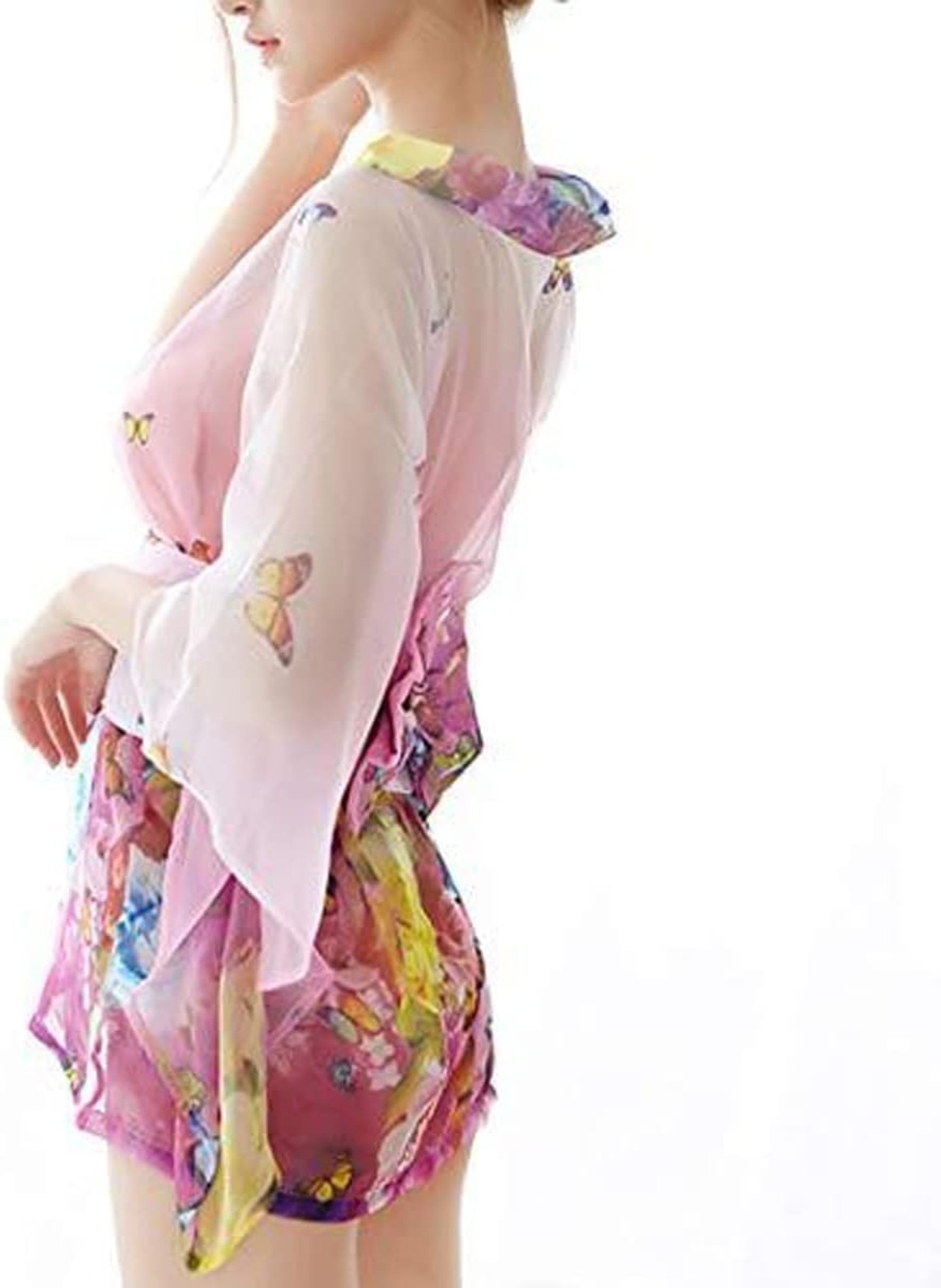 超セクシー ミニ着物ドレス 花魁 コスプレ コスチューム 和風 花柄 薄手 シースルー ミニ浴衣 ランジェリー 着物3点セット (花に舞う蝶(ピンク))