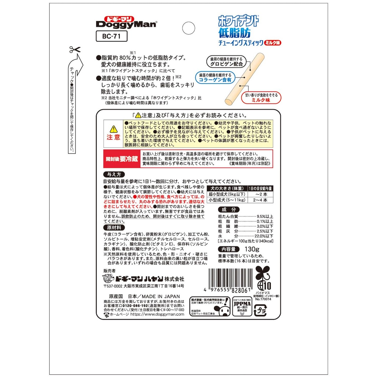 ドギーマン ホワイデント 低脂肪チューイングスティック ミルク味 130g×3袋セット(犬用デンタルおやつ)