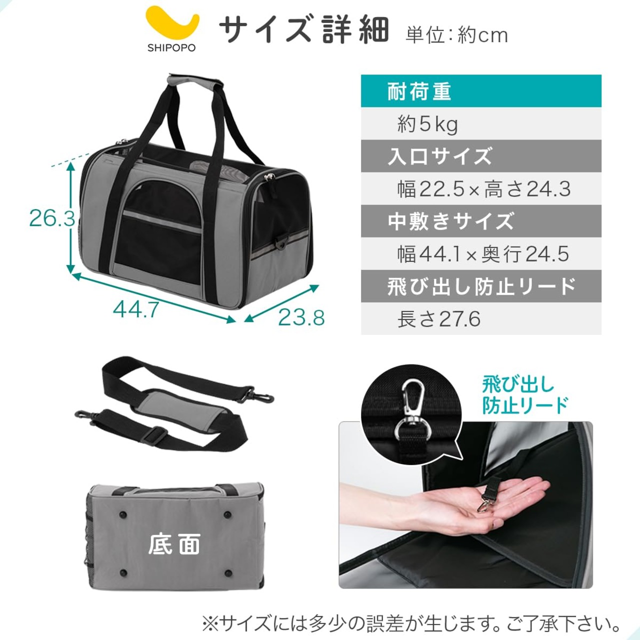 耐荷重:約5kg(超小型犬・猫) / ショルダーベルト、飛び出し防止リード、リフレクター付き
