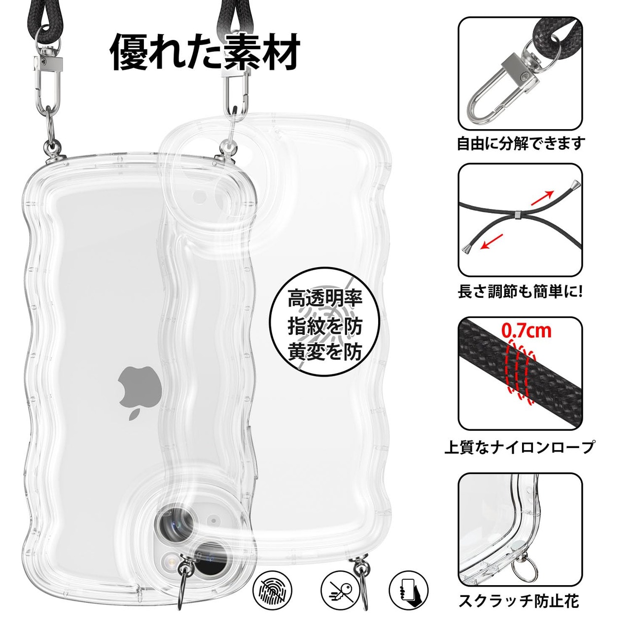 QLTYPRI ケース iPhone 16 用ケース クリア TPUカバー 調節可能な ショルダー 肩がけ 首掛け 紐付き 斜めがけ ウェーブ おしゃれ 韓国 可愛い iPhone16用ケース アクスタ収納 透明 薄型 軽量 耐衝撃 スマホケース ワイヤレス充電対応 ストラップホール付き アイフォン16 ケース 6.1インチ 対応