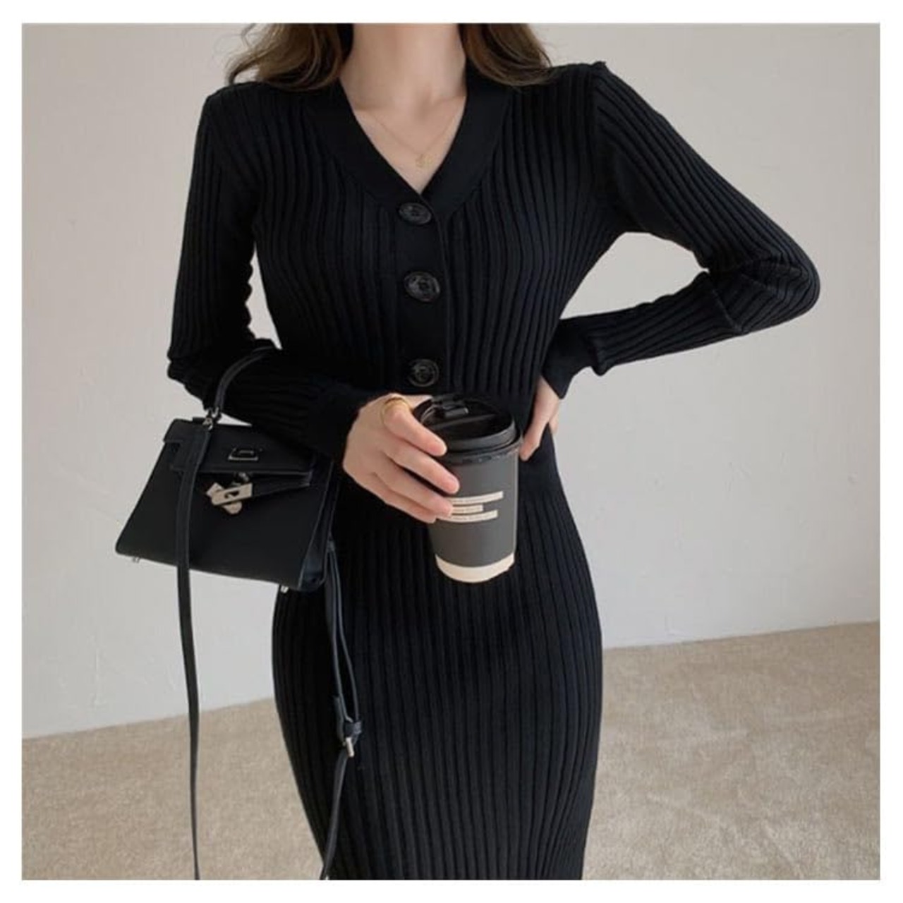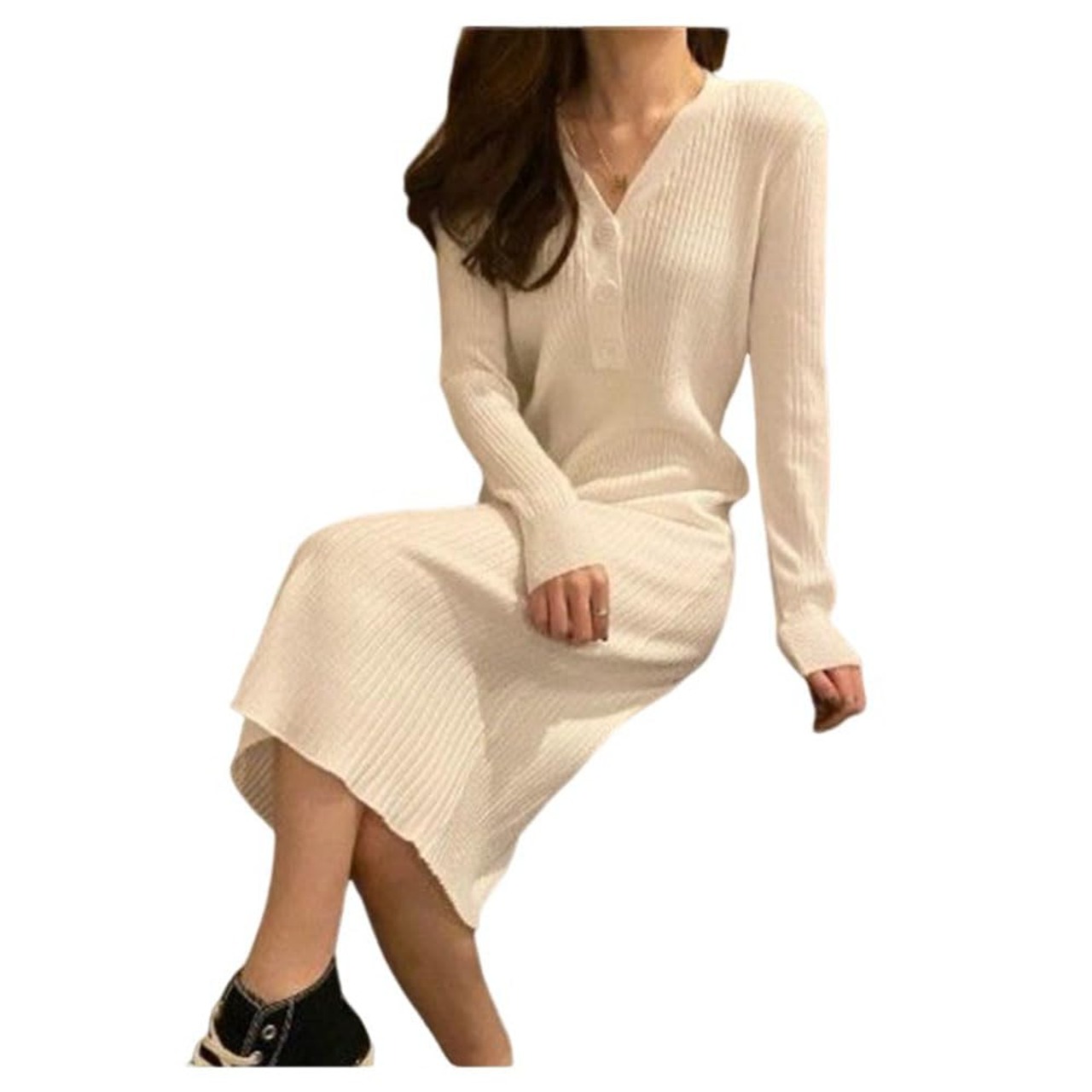 タイト ニットワンピース レディース 秋冬 Vネック 長袖 膝下丈 セーター ロングワンピース リブニット ボディコン ドレス フェミニン エレガント 着やせ 伸縮性 きれいめ 春 秋 冬 S M L XL