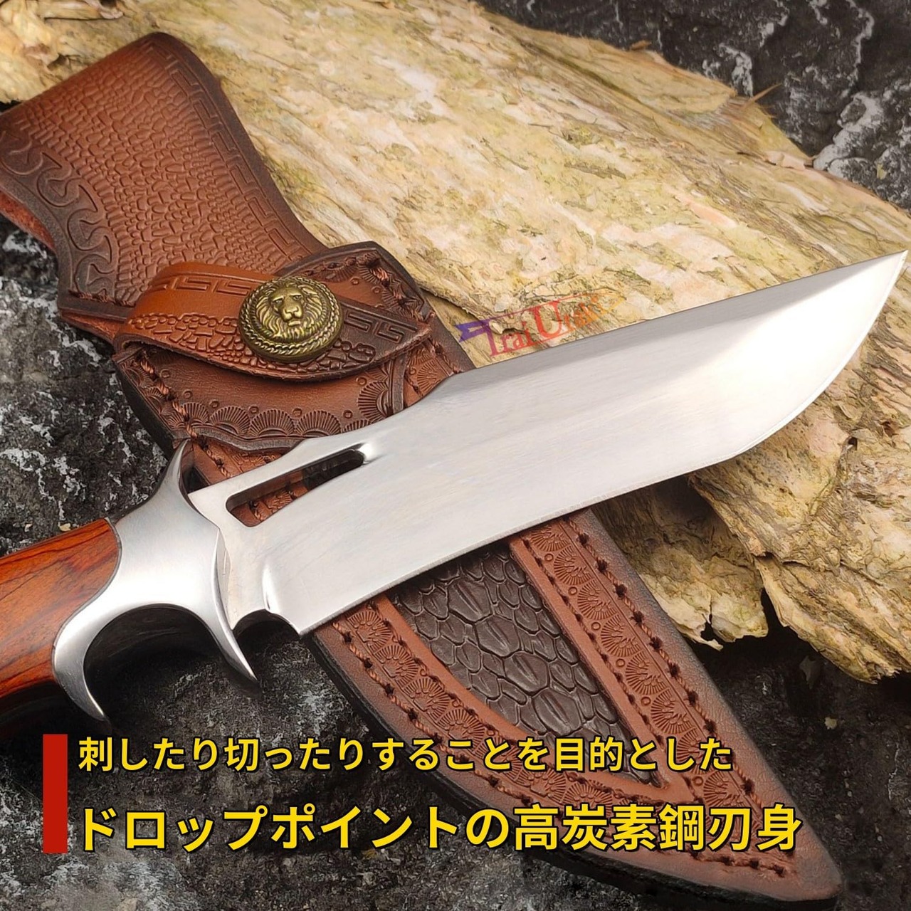 【仕様】サイズ:全長約260mm/刃長約130mm/刃幅約35mm/刃厚約4mm。材質:刃材:高炭素鋼、ヒルト材:ステンレス鋼、柄材:ローズウッド。付属品:革シース。重量:約260g。