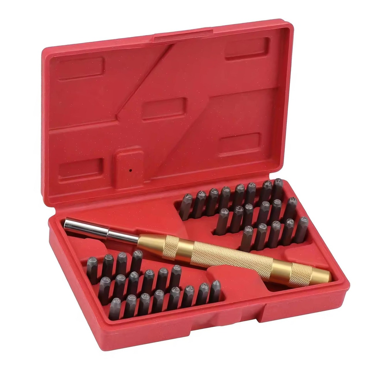 レザークラフトエンボスツールには、レタースタンプパンチツール26個、数字スタンプパンチツール9個、シンボルスタンプパンチツール2個、メタルスタンピングハンドル1個、収納ケース1個が付属しています。注: 番号 6 と 9 はパンチングスタンプを共有します。