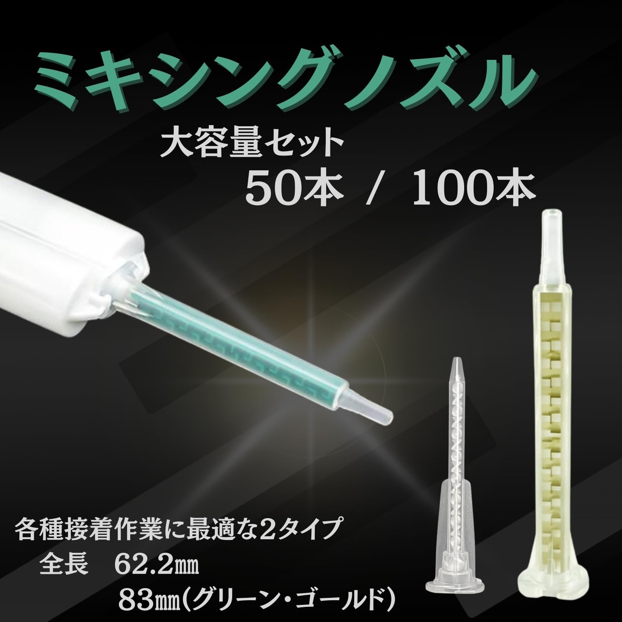 【高品質ミキシングノズル】メグミックスやメタルロックなど各種2液型エポキシ・ウレタン接着剤に使用できるミックスノズルです。内部構造により均一な混合を実現。使用する液剤により、金属、プラスチック、木材など、様々な素材の接着に最適です。【均一混合】スパイラル構造による均一なミキシングで、混合比のズレによる接着不良を防止し、高い接着強度を実現。プロの職人さんも愛用する高品質なミックスノズルです。【特徴】MA規格のカートリッジに使用可能です。※お使いのサイズを確認してください。【接着補修】自動車のボディやバンパー など大きな破損箇所( 接着 、補強 、肉盛 、欠損部品の制作、内部材料等の補強( ライトステ 補強等) 船舶の内外装の補修 建物の外部や内部など、小型部品接着等にもご使用頂けます。用途により液剤を適時選択してください。【使い方】高い汎用性。接着補修作業の際、お手持ちのディスペンサー、アプリケーター、グルーカートリッジに取り付け、接着材料を均一に混ぜるためにご使用ください。【バリエーション】『ショートタイプ』『グリーン83mm』『ゴールド83mm』各、50本セット、100本セット