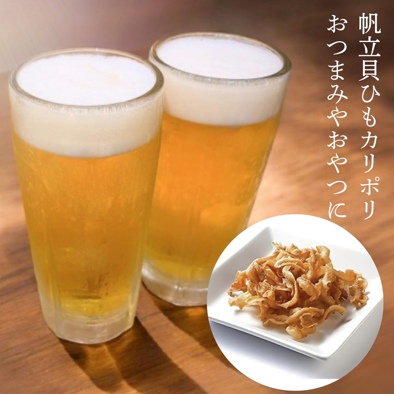 青森県平内町の陸奥湾産ほたて貝ひもに下味を付けてから揚げ味付けしています。 カリッ、ポリッと貝ひもの商品としては今までにない新食感香ばしスナックでおつまみに最適、食べ始めたらきっと最後まで止まらなくなります。