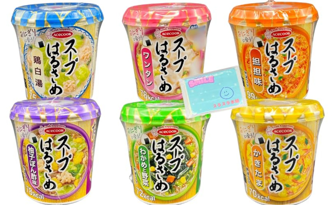 エースコックの『スープはるさめ』を 6種アソートセット にしました。【(1)ワンタン (2)かきたま (3)坦々味 (4)鶏白湯 (5)わかめと野菜 (6)柚子ぽん酢味 】 各種1個ずつ 合計6個のセットです。 ●(1)ワンタン:滑らかで、ちゅるんとした食感のはるさめです。スープとの相性の良さにこだわりました。 鶏ガラの旨みと、香味野菜の風味がしっかり溶け込んだスープに、ほんのりとしょうゆを利かせたバランスの良い中華スープです。食べごたえのあるワンタン、卵、ねぎ、ごまで仕上げました。 ● (2)かきたま:滑らかで、ちゅるんとした食感のはるさめです。スープとの相性の良さにこだわりました。 鰹や貝の魚介の旨みを利かせた、やさしい味わいの和風スープです。卵の風味を活かしたまろやかな味わいに仕上げています。とろっとした食感の卵ブロック、かに風かまぼこ、ねぎで仕上げました。 ●(3)坦々味:滑らかで、ちゅるんとした食感のはるさめです。スープとの相性の良さにこだわりました。 旨みのある豚エキスや豆板醤などを使用し、すりごまとねりごまをたっぷり加えた辛さの中に甘みとコクが味わえる担担味スープです。程良く味付けした肉そぼろ、ねぎ、唐辛子、香りが広がるごまで仕上げました。 ●(4)鶏白湯:滑らかで、ぷりもちっとした食感の平めんタイプのはるさめです。スープとの相性の良さにこだわりました。鶏をベースにガーリックやオニオンの旨みを加え、ペッパーを利かせた鶏白湯スープです。 シャキシャキとした食感の良いキャベツ、大豆そぼろ、ねぎを加えて仕上げました。 ●(5)わかめと野菜:滑らかで、ちゅるんとした食感のはるさめです。スープとの相性の良さにこだわりました。 鰹や昆布をベースに、ガーリックやジンジャー等の香味野菜の旨みを加え、ペッパーを利かせた和風だしのスープです。風味の良いごま、チンゲン菜、わかめ、コーン、人参、ねぎを加えてたっぷり具材に仕上げました。 ●(6)柚子ぽん酢味:たっぷりの具材で満足感抜群の「柚子ぽん酢味」がリニューアル! 滑らかで、ちゅるんとした食感のはるさめです。スープとの相性の良さにこだわりました。 鰹をベースに鯖節や昆布などを加え、柚子果汁の爽やかな風味と酸味を利かせた和風だしのスープです。 シャキシャキとした食感の良いキャベツ、大豆そぼろ、卵加工品、柚子を加えて仕上げました。