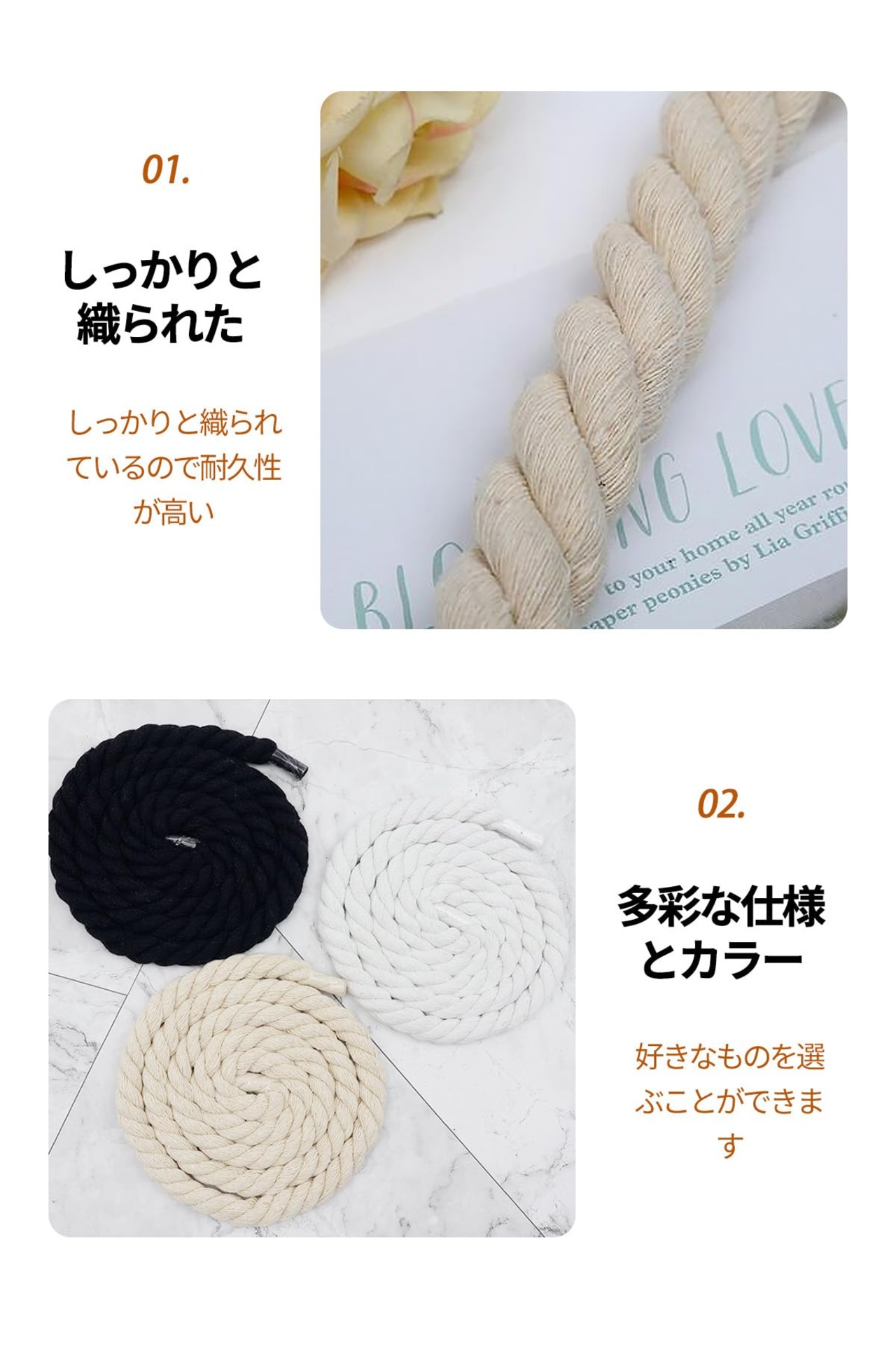 【優れた素材】この製品は、耐熱性と耐摩擦性の天然繊維で作られた3本ストランドコットンロープで構成されており、自然で環境に優しいです。 「スリーストランド」は3本のストランドをより合わせたスタンダードなロープの結束方法で、強度に優れています。そしてある程度の靭性があり、天候や温度の影響で変形することがありません。天然繊維なので、水や土の中で腐食し土に還りますが、環境を汚染しません。