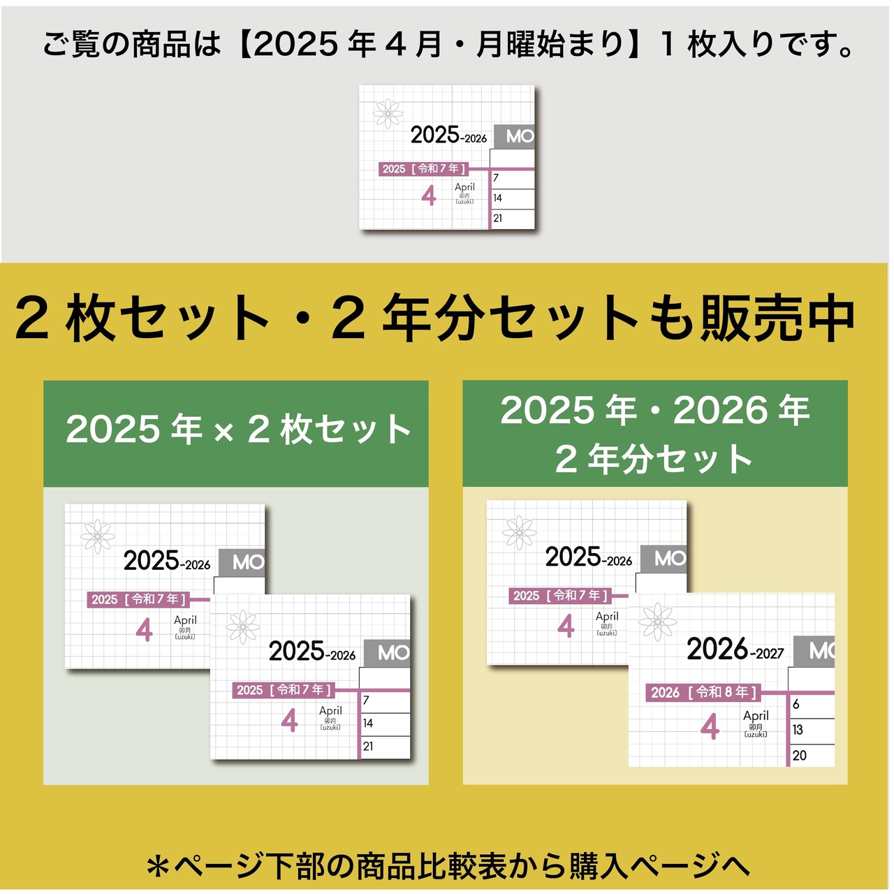 2025年 令和7年、4月始まり 月曜始まり。1年連結カレンダー。