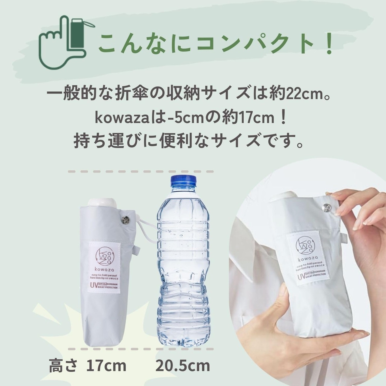 「3秒でたためる傘 urawaza(ウラワザ)」のシリーズから、よりコンパクトサイズになった「パッとさしてサッとしまえる」kowaza(コワザ)が登場。ウラワザは折り畳み傘の煩わしさを解消する構造の傘で、世界初の形態安定技術の採用により、誰でも・すばやく・きれいに折りたたむことができます。その秘密は、傘の裏側に貼られた特殊な形状のPET樹脂シート。透明な特殊シートが畳む際にガイドの役割を果たし、スムーズに折しわを再現することで、生地を軽く振るだけで簡単に畳めます。遮熱・遮光100%・UVカット機能が付いて、雨の日も使用OK。晴雨兼用なので毎日お使いいただけます。収納時は約17cmでコンパクトなので旅行や常備傘にもおすすめです。年代を選ばないシンプルなデザインで、プレゼントとしても嬉しいアイテムです。