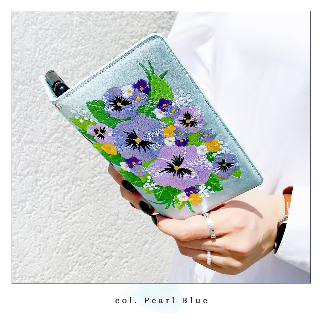【パンジーの花束をフェルト刺繍した華やかな手帳型ケース】印刷ではなく実際に刺しゅうを施しているため、刺繍の部分が若干膨らんでいる場合がございますが、不良品ではございませんので、予めご了承ください。開閉部分にマグネットを内蔵しておりますが、磁器エラーを防ぐために磁器を弱めにしております。カチッと留まるほどではございませんので、予めご了承ください。