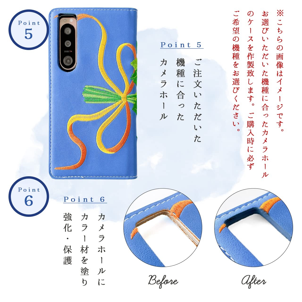 手触りの良いなめらかなPUレザーを使用しております。カメラ・指紋認証の開口部には1点ずつ手作業で丁寧にカラー材を塗って、コーティングしております。ストラップ穴があるため、様々なアレンジが可能となります。機種によってカメラ穴や指紋認証の開口部は異なります。