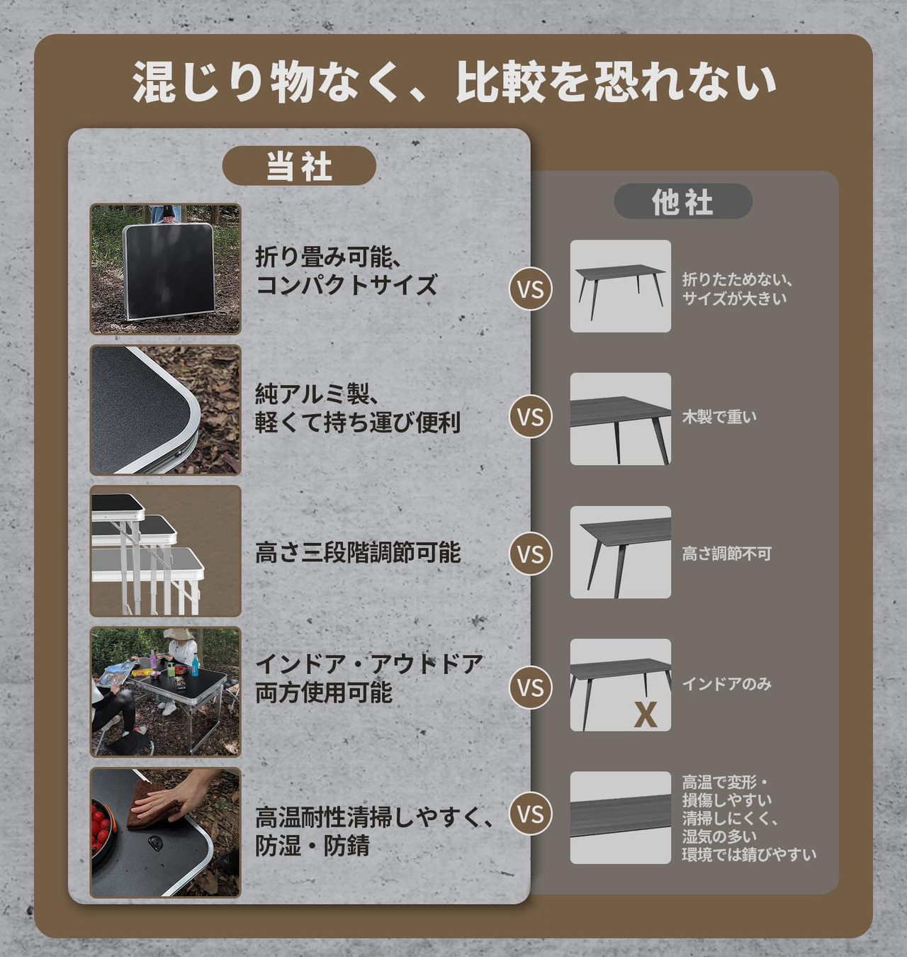 ✅【素材】材質:フレーム/アルミニウム、他、天板/メラミン加工合板(抗菌加工) 。天板の耐熱温度は100℃まで達し、錆びにくく、水と熱にも強いので、鍋やフライパンなどの熱い物を置いたりご使用頂けます。おしゃれな見た目でお手入れも簡単、水や汚れもすぐ落ち、実用性と耐久性を両立しています。手触りがよく、滑り止めだけでなく美しい。人気の木目調素材を採用し、ナチュラルスタイルでよく馴染みます。お部屋でもキャンプでもこれひとつでばっちり。