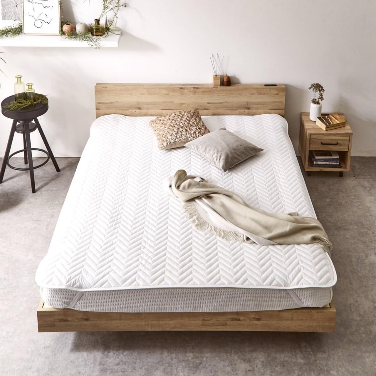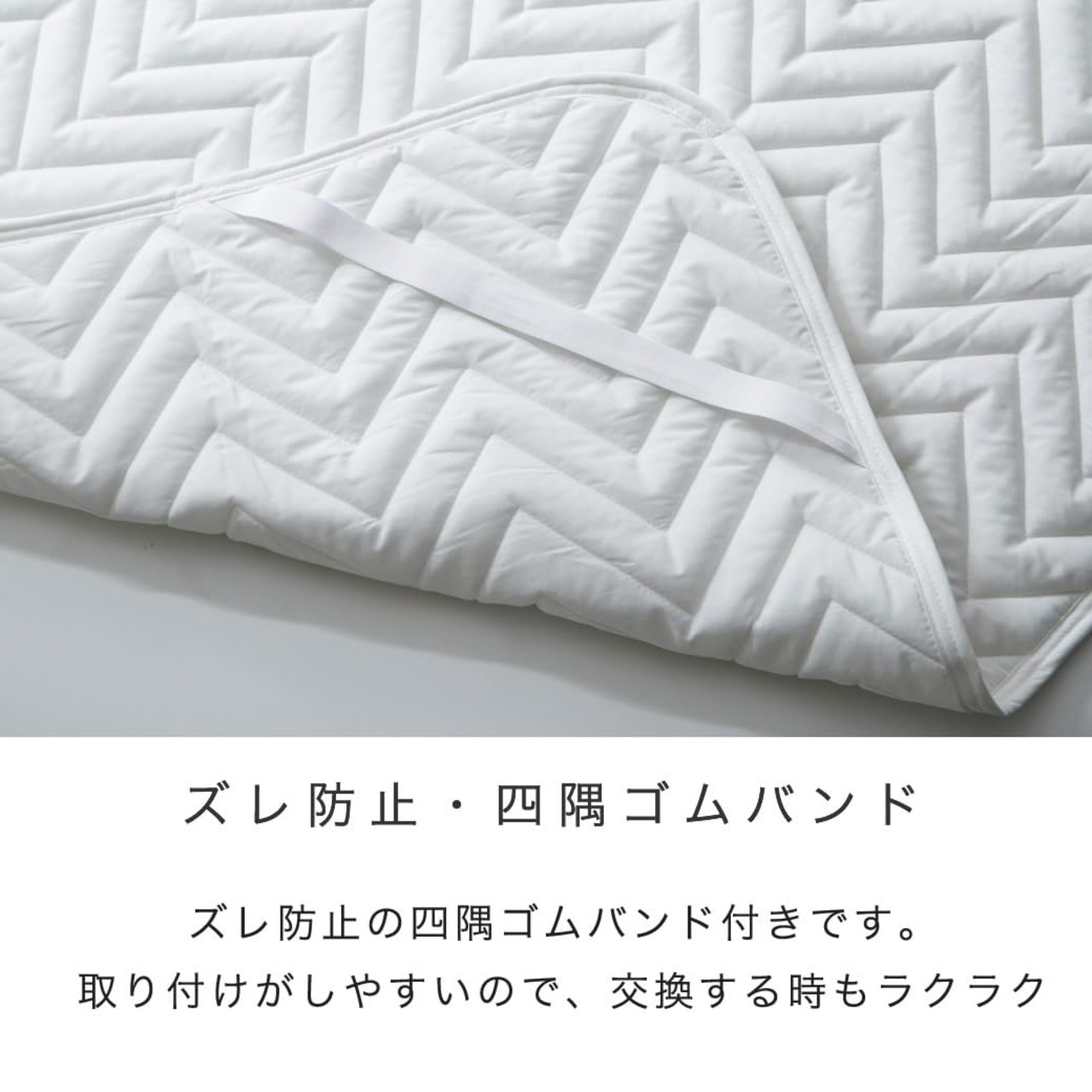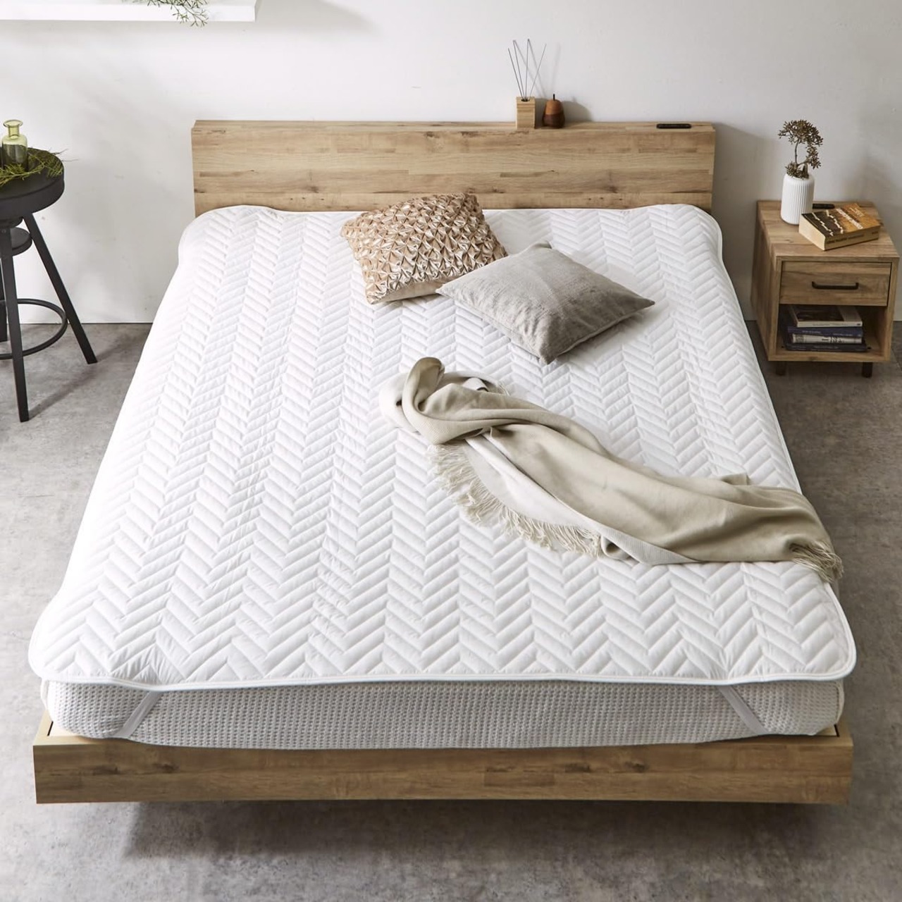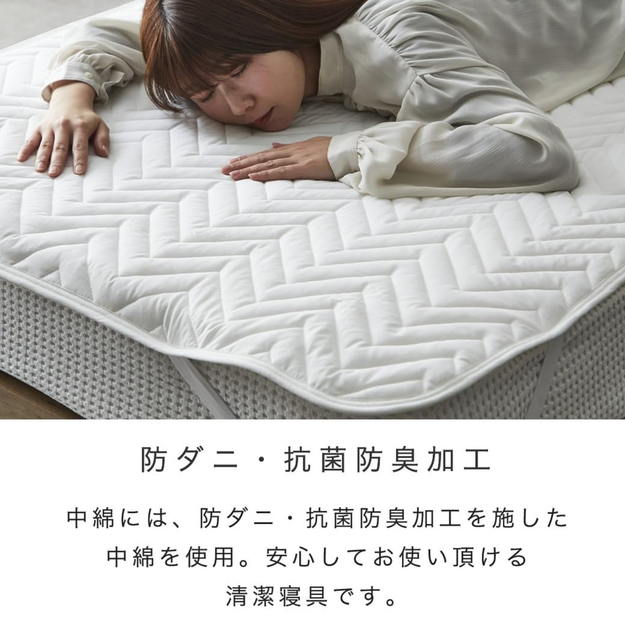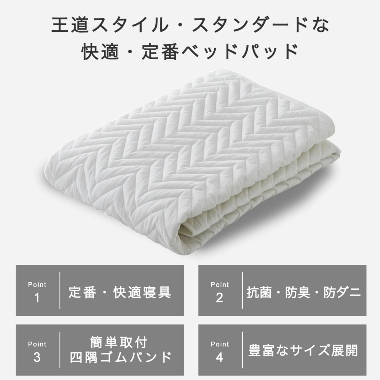 毎日の睡眠のお供に。定番スタイルのベッドパッドです。防ダニ・抗菌防臭加工中綿を使用。ズレ防止の四隅のゴムバンド付きで快適に使用できます。シンプルなデザインで、手軽に使用しやすい定番ベッドパッド。ご家庭の洗濯機で洗えて、お手入れも簡単。いつも清潔で快適な眠りへ。■サイズ(約):幅160 ×長さ195cm ■材質:・側生地:ポリエステル65%、綿35%・中綿:ポリエステル100%(防ダニ・抗菌防臭加工) ■組立:完成品 ■生産国:中国 ■備考:・四隅ゴム ・ご家庭の洗濯機でお洗濯できます。※洗濯ネットをご使用ください。