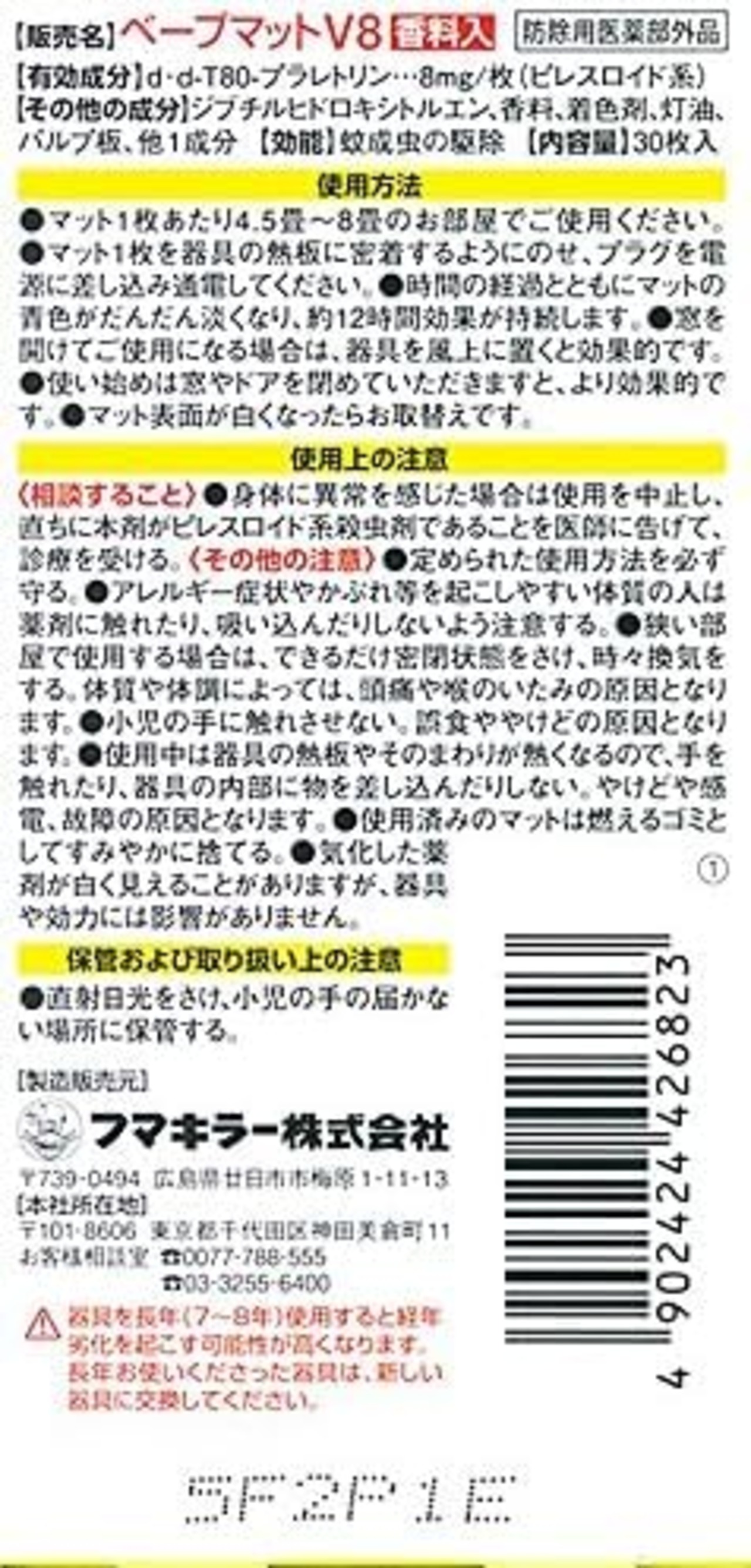 寝苦しい夏の夜、蚊の音やかゆみに悩まされず、<BR> ぐっすり眠りたい方へ――。<BR> 『ベープマット 30枚入り』は、電気式の蚊取り器にセットして使用する<BR> 便利で手軽な防虫マットタイプのアイテムです。<BR> <BR> プレート状のマットには、蚊に対して優れた駆除効果を発揮する<BR> 殺虫成分がしっかりと含まれており、<BR> 加熱されることで成分が空気中に拡散し、<BR> お部屋全体に広がって蚊を寄せつけません。<BR> <BR> 1枚で約12時間効果が持続するため、<BR> 就寝前にセットしておけば朝まで快適に。<BR> 煙や匂いが少ない設計で、寝室や子供部屋、<BR> リビングでも気にならずに使えるのが嬉しいポイントです。<BR> <BR> 電気式蚊取り器(マットタイプ対応)で使用するだけなので、<BR> 火を使わず安心・安全。<BR> お子様やペットのいるご家庭でも使いやすいのも特徴です。<BR> <BR> 30枚入りのパックは、約1ヶ月分の使用量に相当。<BR> 日常的に蚊対策を行いたい方や、<BR> アウトドアやキャンプなど、虫が気になる場面でも大活躍します。<BR> <BR> 引き出しタイプのパッケージで取り出しもスムーズ、<BR> 保管もしやすく、毎日の使いやすさに配慮された設計です。<BR> <BR> ベープマットで、蚊を寄せつけず、<BR> 心地よい空間をキープ。<BR> 快適な夏の暮らしをサポートする、<BR> 頼れる防虫アイテムをぜひお試しください。<BR>