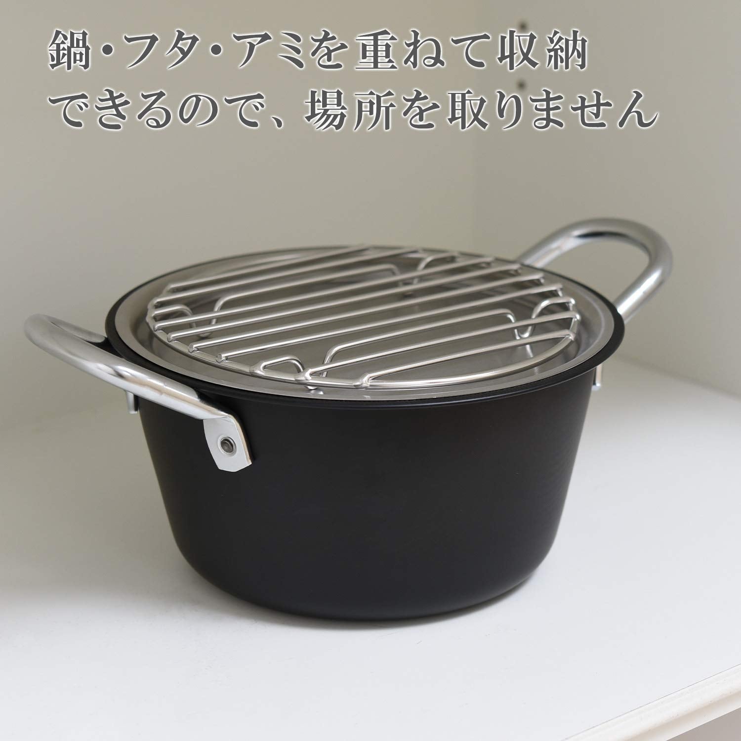 アーネスト 【日本製】 天ぷら鍋 3点セット 燕三条製 (アミ/フタ) エンボス加工 鉄揚げ鍋 ミニ (18cm) 深型 (ガス/IH対応) Kararipo A-77360 ブラック