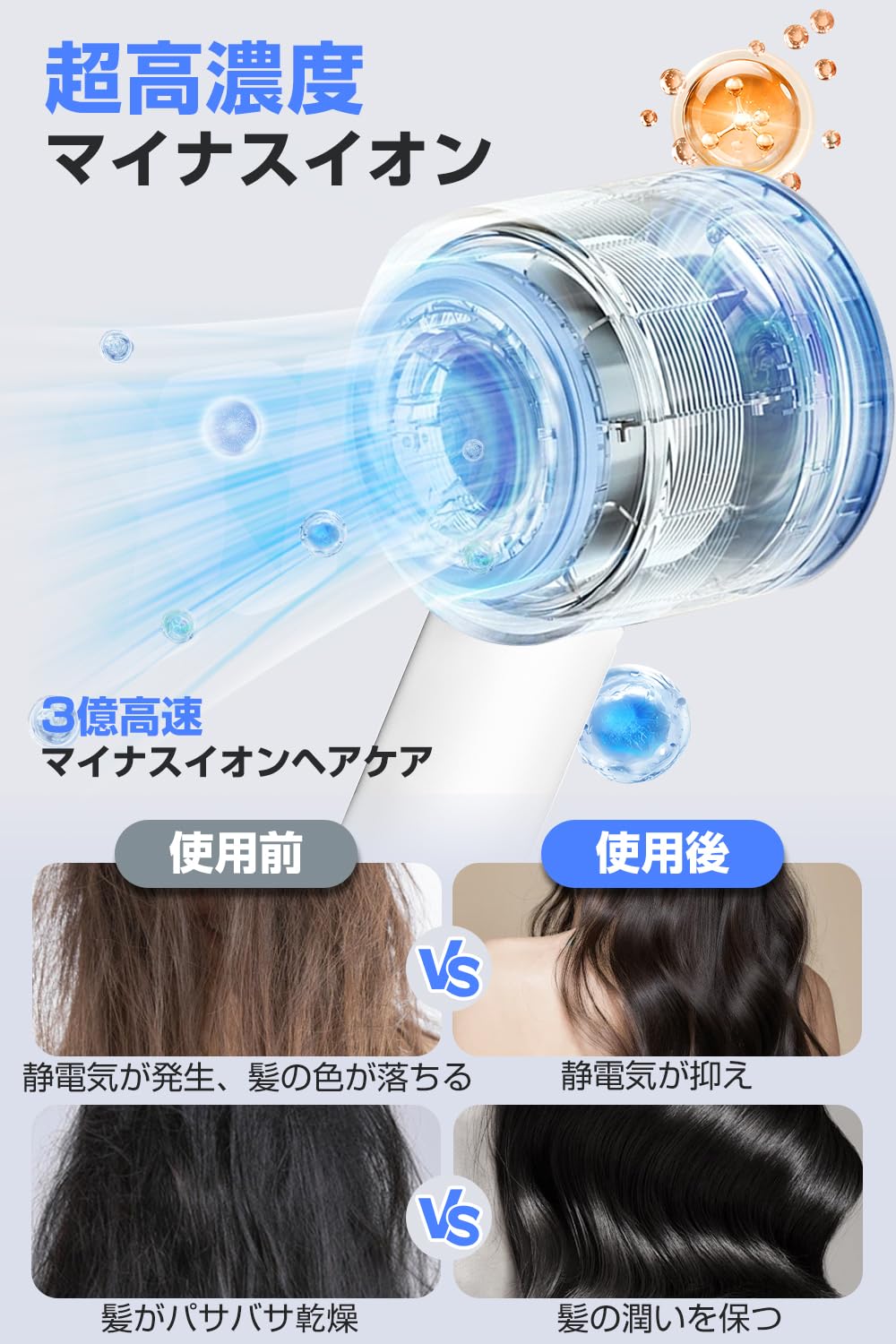 【斬新デザイン・3億マイナスイオン・ワンタッチ冷風】 ドライヤー ヘアドライヤー 1300W超大風量 速乾 ブラシレスDCモーター 温冷風ワンタッチ切替 美髪 ヘアケア NTC温度制御システム 過熱防止 軽量 低騒音 持ち運び便利 3億高濃度マイナスイオン 静電気除去 美容師監修 ヘアサロン/家庭用 PSE認証済み 日本語説明書/マグネティックノズル付き (ホワイト)