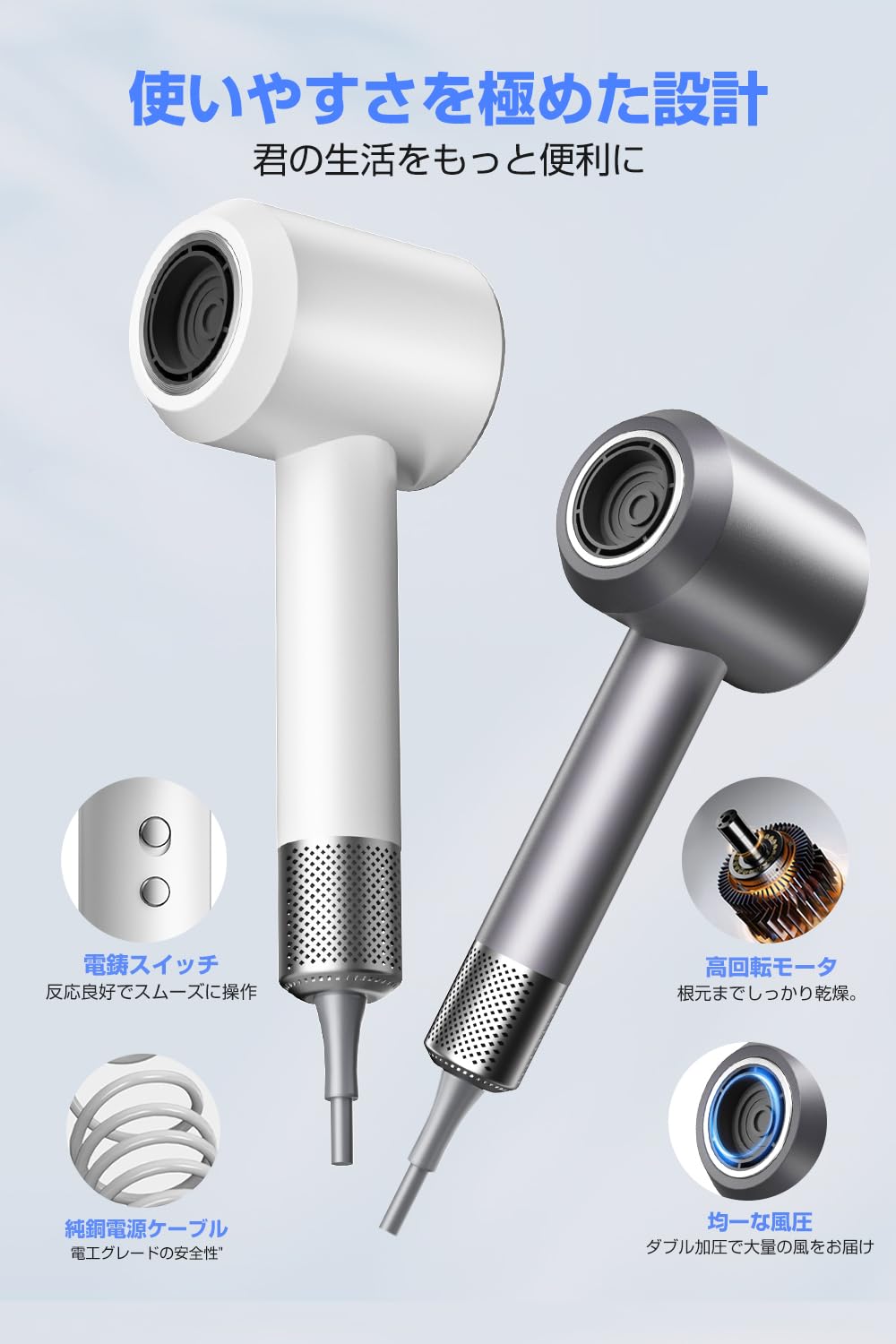 【斬新デザイン・3億マイナスイオン・ワンタッチ冷風】 ドライヤー ヘアドライヤー 1300W超大風量 速乾 ブラシレスDCモーター 温冷風ワンタッチ切替 美髪 ヘアケア NTC温度制御システム 過熱防止 軽量 低騒音 持ち運び便利 3億高濃度マイナスイオン 静電気除去 美容師監修 ヘアサロン/家庭用/旅行用 PSE認証済み 日本語説明書/マグネティックノズル付き (グレー)
