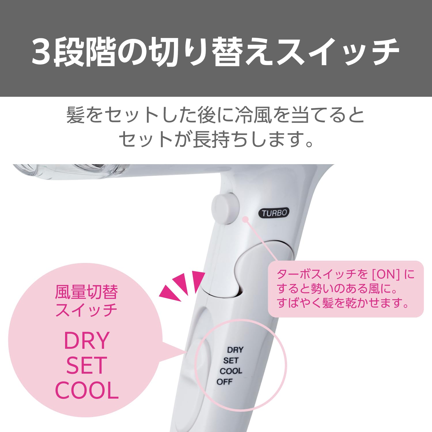 385gの軽量ボディで1.5m3/分※2の大風量を実現。コンパクトで、軽いのにすばやく乾かせるから、ストレスフリーで使えます。※1:TID420との比較※2 :スイッチポジション[DRY - TURBO - ON]使用時