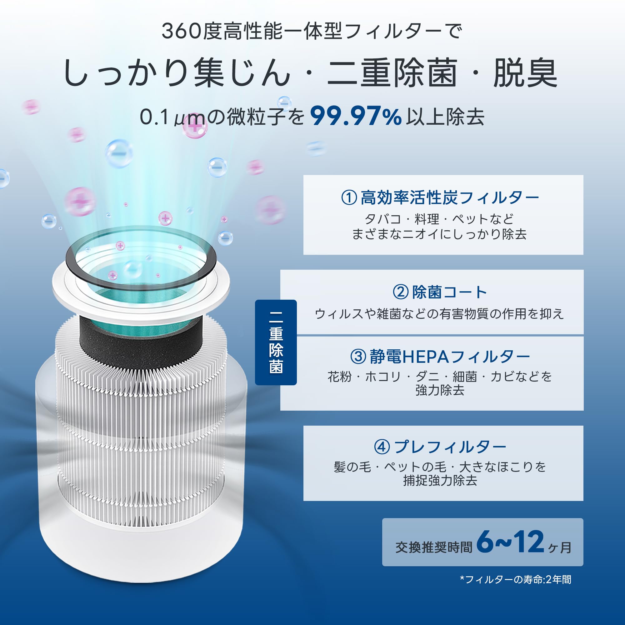 【3層ろ過・2層除菌で、空気の悩みから解放! 】菌・ホコリ・カビ・アレルゲン・PM2.5・たばこ・ペットの臭いや抜け毛をしっかり除去する、高性能の一体型フィルターを採用しています。0.1μmの微粒子を99.97%まで、除菌率は99.99%まで取り除くことが可能です。これにより、くしゃみや鼻水、鼻のかゆみといった症状を和らげ、より快適な生活をお届けします。