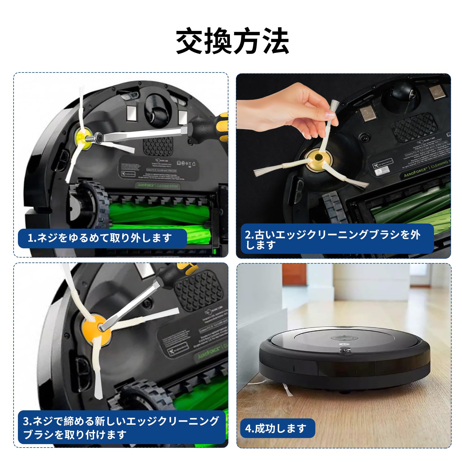 【ルンバ用エッジクリーニングブラシ】部屋や壁際の四隅のゴミを回転しながら、前方へかき出すためのルンバ用ブラシです。<br><br>【対応機種】ルンバ500/600/700/800/900シリーズに対応します。510 527 530J 531 537 550 551 560 561 570J 577 606 620 621 622 623 624 625 626 627 628 629 630 631 641 642 671 680 690 691 692 693 694 760 770 780 790 870 871 875 876 878 880 885 890 960 980などに対応します。<br><br>【幅広い交換性】青色サイドブラシモジュールと灰色サイドブラシモジュールどちらの製品にも適合できます。<br><br>【使用方法】1.古いネジをゆるめて取り外します。2.新しいエッジクリーニングブラシを元の場所に取り付けます。3.付属のネジで締めます。<br><br>【12か月保証】ご購入日から12か月保証を提供いたします。万が一、問題がございましたら、ご連絡を頂けると迅速に対応致します。お客様にご満足頂けるよう精一杯頑張ります。